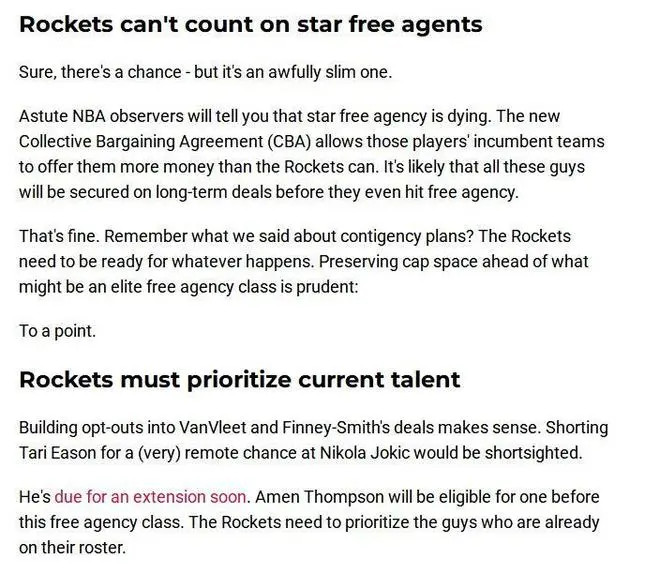 换句话说,火箭队未来可能还需要去自由球员市场上追逐巨星。比如2027年的休赛期,就会有很多成为自由球员或者是拥有球员选项的巨星。