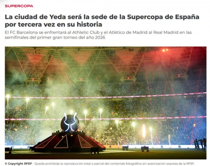 赛事将在2026年1月7日周三到1月11日周日之间(北京时间为1月8日到12日)举行,为期五天,三场比赛全部在吉达举行。参赛队伍和对阵分别是巴萨vs毕尔巴鄂竞技、马竞vs皇马。