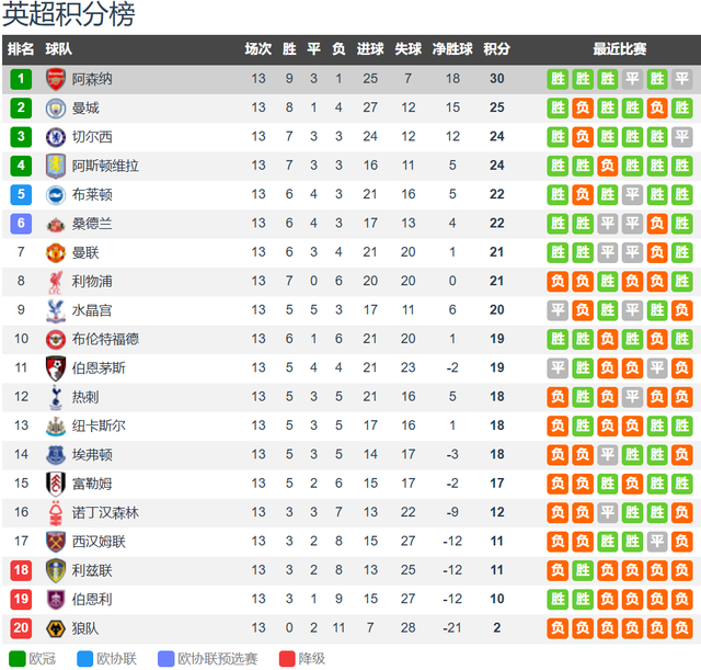 英超13轮战罢,阿森纳30分排名第一,曼城25分排名第二,切尔西和阿斯顿维拉都是24分,排名前四,布莱顿和桑德兰22分排名前六,曼联和利物浦21分排名前八。英超本赛季竞争很激烈,排名第二到第八之间仅差4分。