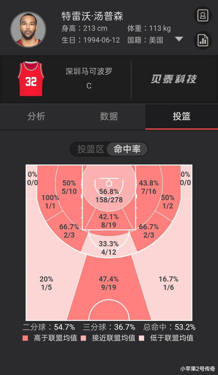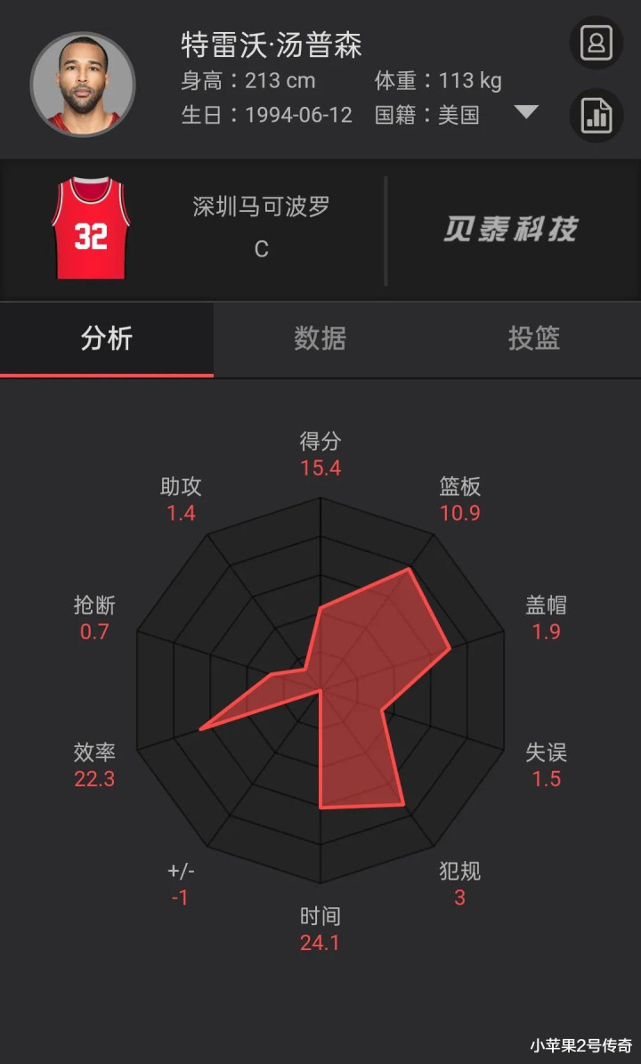 汤普森现年31岁,拥有213的身高113公斤体重,司职五号位。