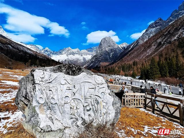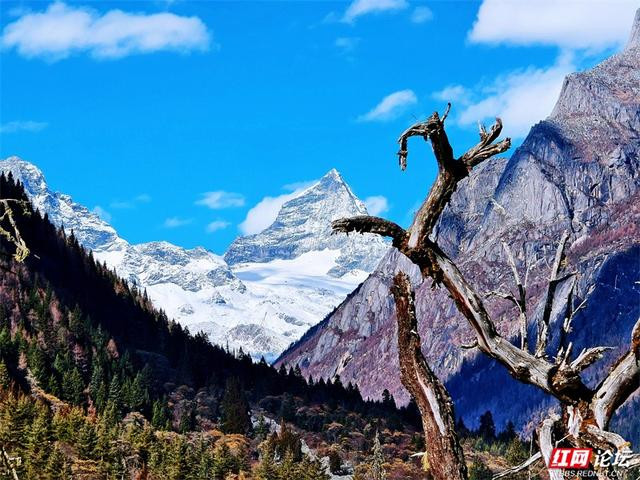 这里,湖是天空的碎片。冰湖幽蓝,泊着枯树的静影。水色有时是翡翠,有时是琉璃,雪山在波纹里微微晃动——仿佛一触即碎,又亘古如初。这里,山是时间的雕塑。四座雪峰并肩而立,积雪终年不化。阳光掠过山脊时,岩石的肌理如青铜铭文,刻着风、冰川和亿万次日出日落的记忆。栈道蜿蜒向林深处,经幡在风里念诵悠长的祝福。冬意浸染森林,从墨绿到霜白,又忽然在某个转弯处,遇见一整座雪山劈面而来的凛冽与寂静。